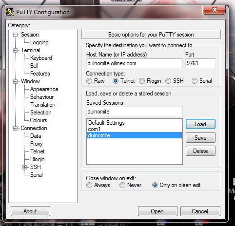 Here is how I set up my PuTTY to work to the DuinoMite at the Olimex site.
