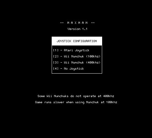 MaxMan 1.1 is here! New Features over 1.0... 1) Fast key response at the "Insert Coin" prompt for the start of a game. 2) Slightly more aggressive ghost chase intelligence. 3) Support for Wii Nunchuk with 100Khz and 400khz IC2 transmission speeds. 4) Fast loading of game screen via fonts file! This is the final version. Project finished. Enjoy!