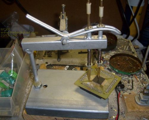 HI, Downwind made me a tool for locating SMD devices to facilitate easier soldering. He doesn't remember posting a picture of the tool. I found it wonderful for holding the PIC32 in place while I soldered it. The curved lever allows one brass pin to be lifted before the other so that the back pin can hold the PCB still whilst positioning and then pinning component. It is brilliant. In the back ground is the jaws of a PCB holder vise that allows the board to be flipped over. David M. |