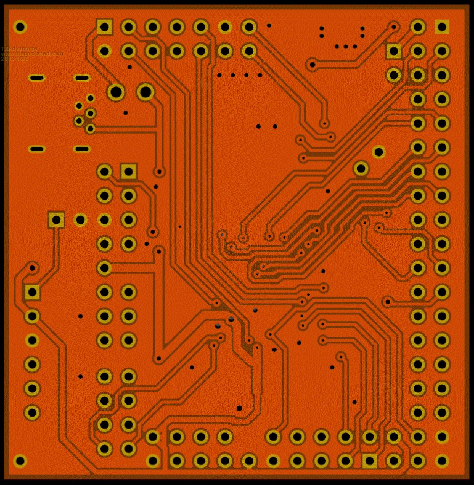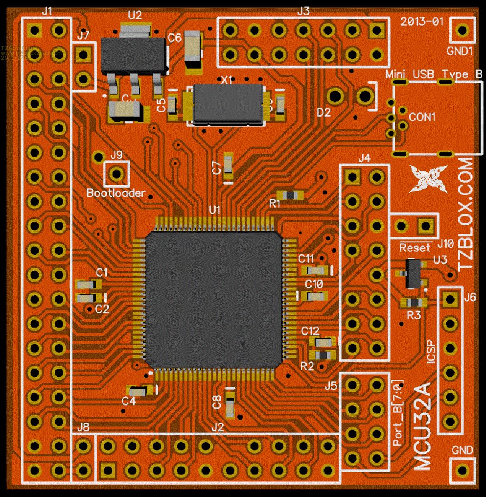 Here are my schematics of the small pic32 board. I would welcome feedback and error spotting. It also contains tables summing all the possible pin uses. My first project using Diptrace, it went pretty smooth. The design has many uses in mind and can be hooked up in different ways. With female connectors it can be used for prototyping. For production it can be put on a 'motherboard', use a backplane when lots of circuitry has to be controlled, a board can be piggy backed (this will be my way of mankig it MM compatible), or pigy back a small CAN and LCD module, or a GPS module etc... The goal is to make the step from prototyping to final product very smooth as you can use the same part for both. In the minimal form it should already be able to run MMBasic and use it through the USB with a terminal. After error spotting this will be send of to make some prototype pcb's, if someone wants want to help me test it, i would be glad for the help and send you one. (Printing to a pdf has some label offset problem. Not able to fix that, probably need another, i use bullzip pdf printer now. No such problems with a real printer.) 2013-01-28_073903_DipTrace_Schematic_-_TZBlox-CPU_32_rev_C.d ch.pdf Size of the board is 50mm x 49mm. front: