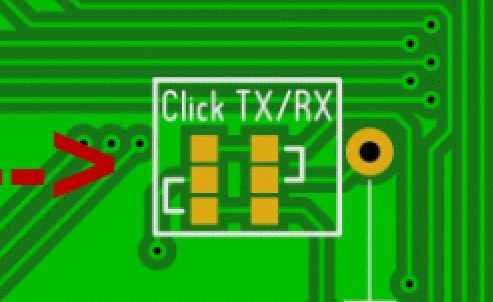 Quick question as I skimmed through this thread and couldn't see the answer Can anyone tell me what the 6 pcb squares marked click TX/RX means and how to use these? I presume they are solder points for jumpers for something? |