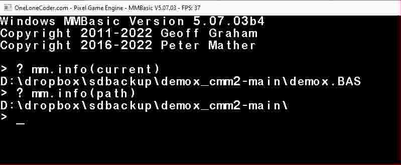 I'm afraid not. MM.INFO$(DIRECTORY) returns the current working directory (like CWD$ but not identical in all circumstances). MM.INFO$(PATH) retuns the directory containing the currently running program, i.e. the parent of MM.INFO$(CURRENT). Best wishes, Tom Edited 2022-03-07 22:50 by thwill MMBasic for Linux, Game*Mite, CMM2 Welcome Tape, Creaky old text adventures |