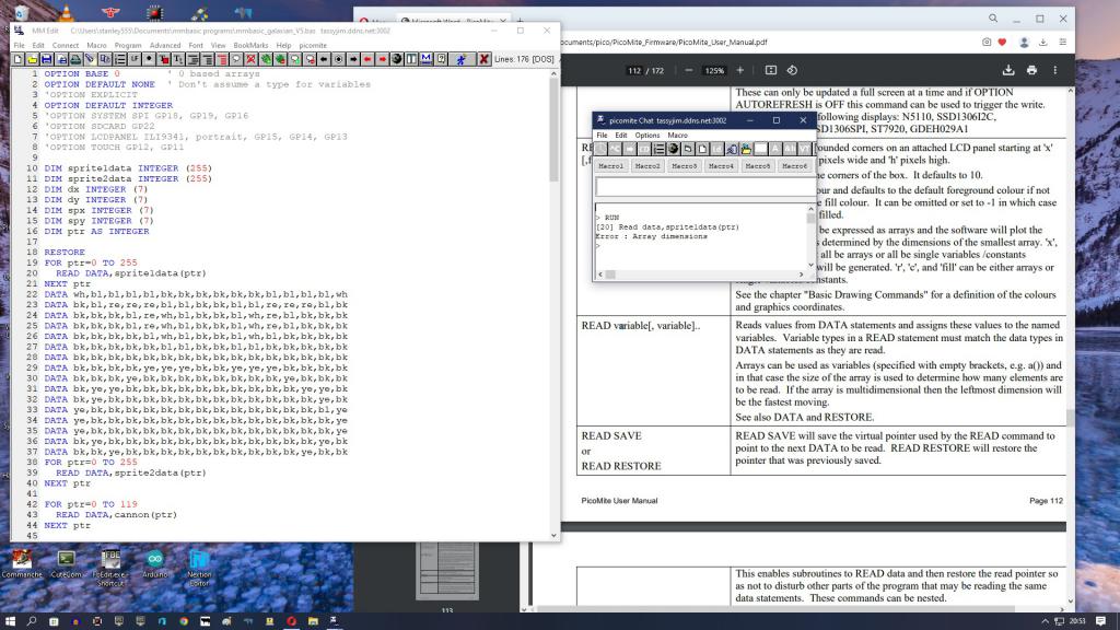 @Mixtel90 My "miracle" device is the Micromite. MMBasic on a 28-pin PIC is not far short of a miracle in my eyes. I don't know how Geoff managed to do that bit of magic, but I'm really grateful that he did. :) It still makes me smile when I hook one up to Tera Term and have a play. Please say more , what pic? You can get 32bit arduino boards. Are any supported? I'm happy with rpi pico and mmbasic. I really like all the glcd buttons and dials and gauges and touch interrupts. Better, IMHO than a Nextion touch lcd and a pic/arduino to run it. Cheaper to. Win 10 sees rpi as pico in devices, not com x. Teraterm finds the rpi pico on win 10 as com13:usb serial device. putty needs input com port but win 10 doesn't show it as a com number. |