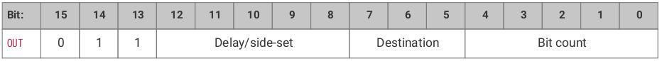 pio program line 1, 4,&b0111000000000001 'OUT: Shift bits out from OSR to dest: GP2. Side-set GP0=1 start shift clk pulse.