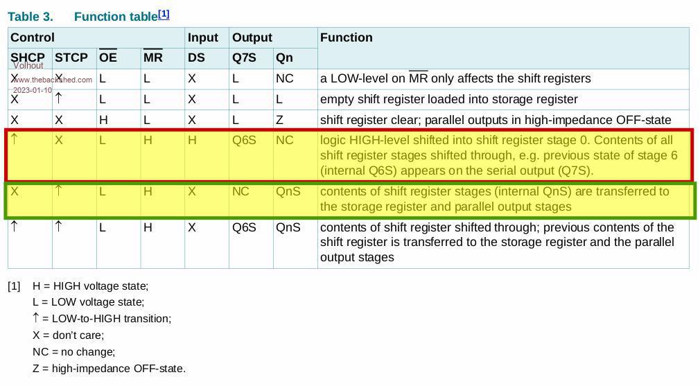 'SHIFTCTRL: shift out of OSR to the right; LSB first. Please note that LSB will set 74HC595 Q7 and MSB sets Q0.