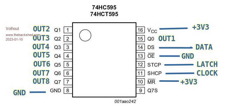 '74HC595 Shift Register. Serial data in, paralell data out. FN 9.1.2023.