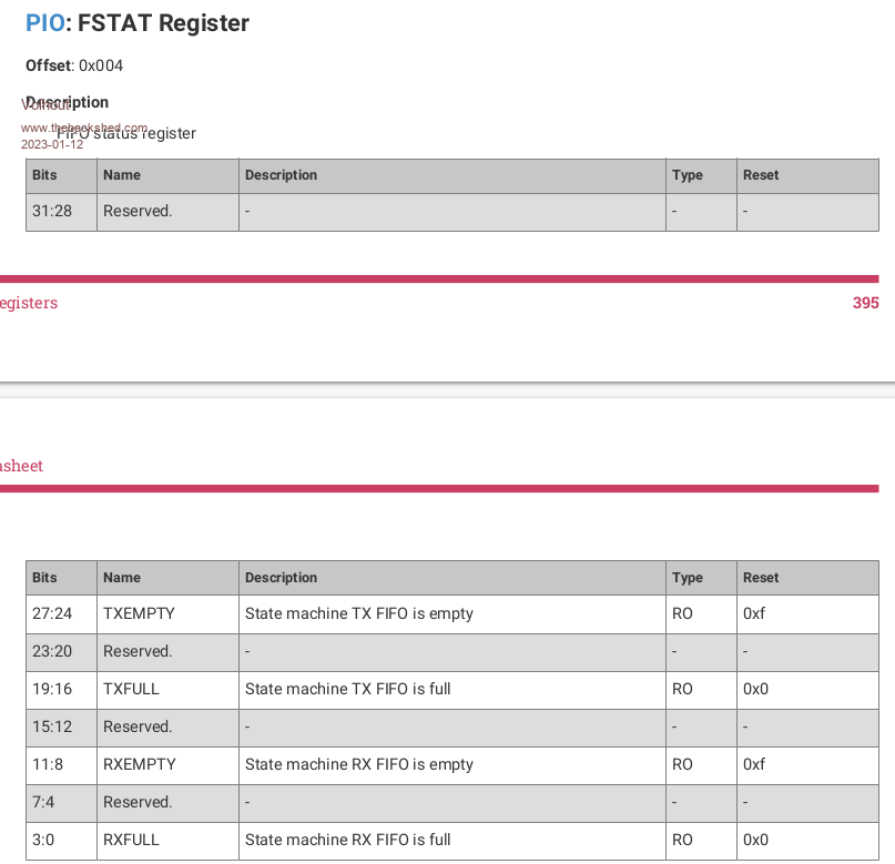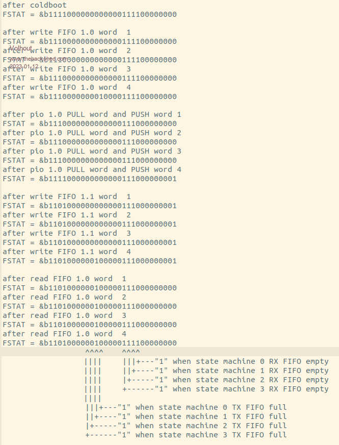 pio program line 1, 3,&b1000000010100000 'PULL:load 32bit word from TX-FIFO into OSR. Stall if FIFO is empty.