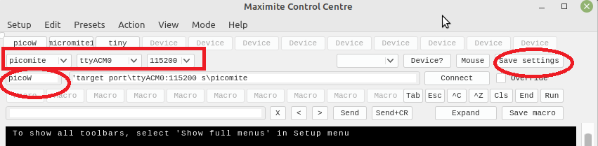 Thanks for the file. It all looks OK and you should be seeing the picoVGA when you restart. There were a few 'mistakes' introduced when the short menus were added. I have made a few changes which will help when presets are not set. The Linux version lists ttyACM before ttyUSB now so the default will be ttyACM0 This suits most new users. The default speed will be 115200 to keep away from 1200 accidents. The default new system device will be picomite. There is no difference between picomite and picoVGA as far as MMCC is concerned. Now, when you restart the last used setting will (hopefully) reappear. I will update the main download tomorrow. Thanks for helping the program better. Jim VK7JH MMedit |