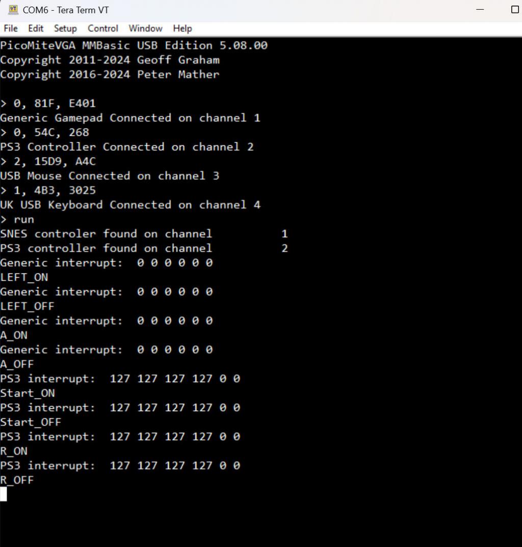 UPDATE Please see a WORKING test/example program on my current development build. Note how an individual interrupt can be allocated to each of the channels on a USB hub when a gamepad of any sort is plugged in. Following my earlier post and Tom's response, this is how I would intend that the gamepad interface works. Of course, the gamepad can also be polled if required using the DEVICE(GAMEPAD function as in the interrupt. The interrogation of buttons and analogue values are exactly the same as for a Wii Classic and the same as the CMM2. As per the picture this program was running with both a functional keyboard and mouse also connected. Currently left to do is the code to format PS4 data as per the other controllers and providing a MMBasic interface to the mouse. Const ps4=128 Const ps3=129 Const snes=130 For i=1 To 4 If MM.Info(usb i)=ps3 Then PS3channel=i Print "PS3 controller found on channel ",PS3channel EndIf If MM.Info(usb i)=130 Then SNESchannel=i Print "SNES controler found on channel ",SNESchannel EndIf Next If PS3channel Then Device gamepad interrupt enable PS3channel,ps3int If SNESchannel Then Device gamepad interrupt enable SNESchannel,genericint Pause 1000 Do Loop Sub ps3int Print "PS3 interrupt: "; myint ps3channel End Sub Sub genericint Print "Generic interrupt: "; myint SNESchannel End Sub Sub myint(USBchan) Print DEVICE(gamepad USBchan, lx); Print DEVICE(gamepad USBchan, ly); Print DEVICE(gamepad USBchan, rx); Print DEVICE(gamepad USBchan, ry); Print DEVICE(gamepad USBchan, l); Print DEVICE(gamepad USBchan, r) Static integer l%=0 m%=1 a%=DEVICE(gamepad USBchan, b) t%=l% Xor a% If t% And m% Then If a% And m% Then : Print "R_ON":Else : Print "R_OFF":EndIf EndIf Inc m%,m% If t% And m% Then If a% And m% Then : Print "Start_ON":Else : Print "Start_OFF":EndIf EndIf Inc m%,m% If t% And m% Then If a% And m% Then : Print "Home_ON":Else : Print "Home_OFF":EndIf EndIf Inc m%,m% If t% And m% Then If a% And m% Then : Print "Select_ON":Else : Print "Select_OFF":EndIf EndIf Inc m%,m% If t% And m% Then If a% And m% Then : Print "L_ON":Else : Print "L_OFF":EndIf EndIf Inc m%,m% If t% And m% Then If a% And m% Then : Print "DOWN_ON":Else : Print "DOWN_OFF":EndIf EndIf Inc m%,m% If t% And m% Then If a% And m% Then : Print "RIGHT_ON":Else : Print "RIGHT_OFF":EndIf EndIf Inc m%,m% If t% And m% Then If a% And m% Then : Print "UP_ON":Else : Print "UP_OFF":EndIf EndIf Inc m%,m% If t% And m% Then If a% And m% Then : Print "LEFT_ON":Else : Print "LEFT_OFF":EndIf EndIf Inc m%,m% If t% And m% Then If a% And m% Then : Print "ZR_ON":Else : Print "ZR_OFF":EndIf EndIf Inc m%,m% If t% And m% Then If a% And m% Then : Print "X_ON":Else : Print "X_OFF":EndIf EndIf Inc m%,m% If t% And m% Then If a% And m% Then : Print "A_ON":Else : Print "A_OFF":EndIf EndIf Inc m%,m% If t% And m% Then If a% And m% Then : Print "Y_ON":Else : Print "Y_OFF":EndIf EndIf Inc m%,m% If t% And m% Then If a% And m% Then : Print "B_ON":Else : Print "B_OFF":EndIf EndIf Inc m%,m% If t% And m% Then If a% And m% Then : Print "ZL_ON":Else : Print "ZL_OFF":EndIf EndIf l%=a% End Sub ![]() Edited 2024-02-02 00:38 by matherp |