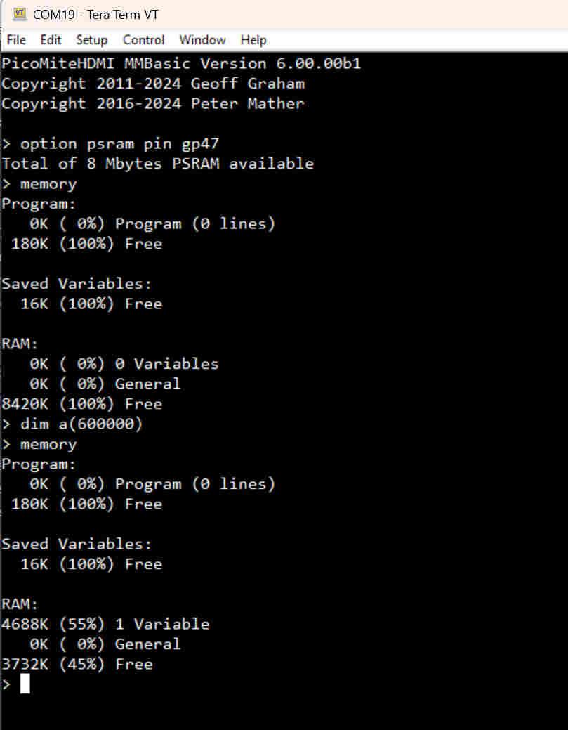> memory Program: 0K ( 0%) Program (0 lines) 208K (100%) Free Saved Variables: 16K (100%) Free RAM: 0K ( 0%) 0 Variables 0K ( 0%) General 250K (100%) Free > option list PicoMite MMBasic Version 6.00.00b0 OPTION FLASH SIZE 4194304 OPTION COLOURCODE ON OPTION CPUSPEED 150000 'KHz OPTION DISPLAY 43, 96 > files A:/ <DIR> . <DIR> .. 00:00 01-01-2000 4 bootcount 04:39 01-01-2000 449 hexdump.bas 00:26 01-01-2000 462 hexdump1.bas 01:09 01-01-2000 74 test.bas 00:01 01-01-2000 60 test1.bas 2 directories, 5 files, 2568192 bytes free > PicoMite MMBasic Version 6.00.00b2 Copyright 2011-2024 Geoff Graham Copyright 2016-2024 Peter Mather > memory Program: 0K ( 0%) Program (0 lines) 256K (100%) Free Saved Variables: 16K (100%) Free RAM: 0K ( 0%) 0 Variables 0K ( 0%) General 304K (100%) Free > files A:/ <DIR> . <DIR> .. 00:00 01-01-2000 4 bootcount 2 directories, 1 file, 2330624 bytes free > RAM is also larger and the contents of drive A: are erased. Jan |