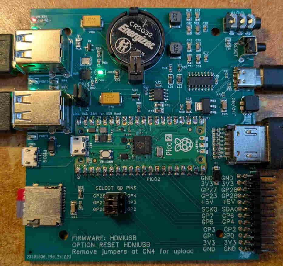 Just got some of the latest boards made by JLC ![]() All the design files are now available on github This includes a dxf file for matching end-plates for the MULTICOMP MCRM2015S or HAMMOND RM2015S box. I will have 4 of these boards available for sale in the UK in about three weeks time. Cost to me including shipping and import duty was GBP24 each so add UK postage and that is the cost. You will need to supply and solder a Pico2 to complete. As before the board includes a 4-port USB hub for connecting keyboard, mouse and gamepads, HDMI output, battery backed real-time clock, CH340 console (if required), SDcard, and PWM audio. Everything you need for a boot-to-Basic computer. |