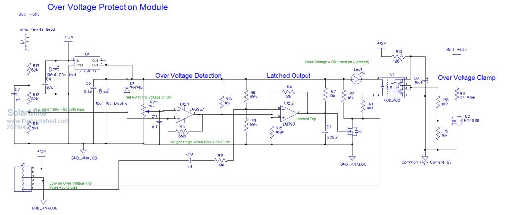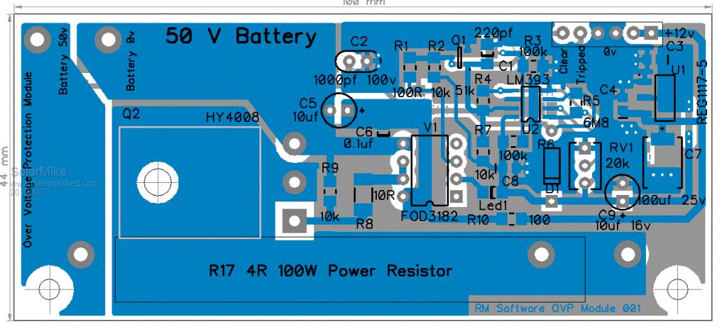 OK, have completed the layout for the Over voltage protection part, made as a plugin board 100mm x 44mm that sits atop the main power board above the mosfets and pickups the main power tracks etc from the mother board.