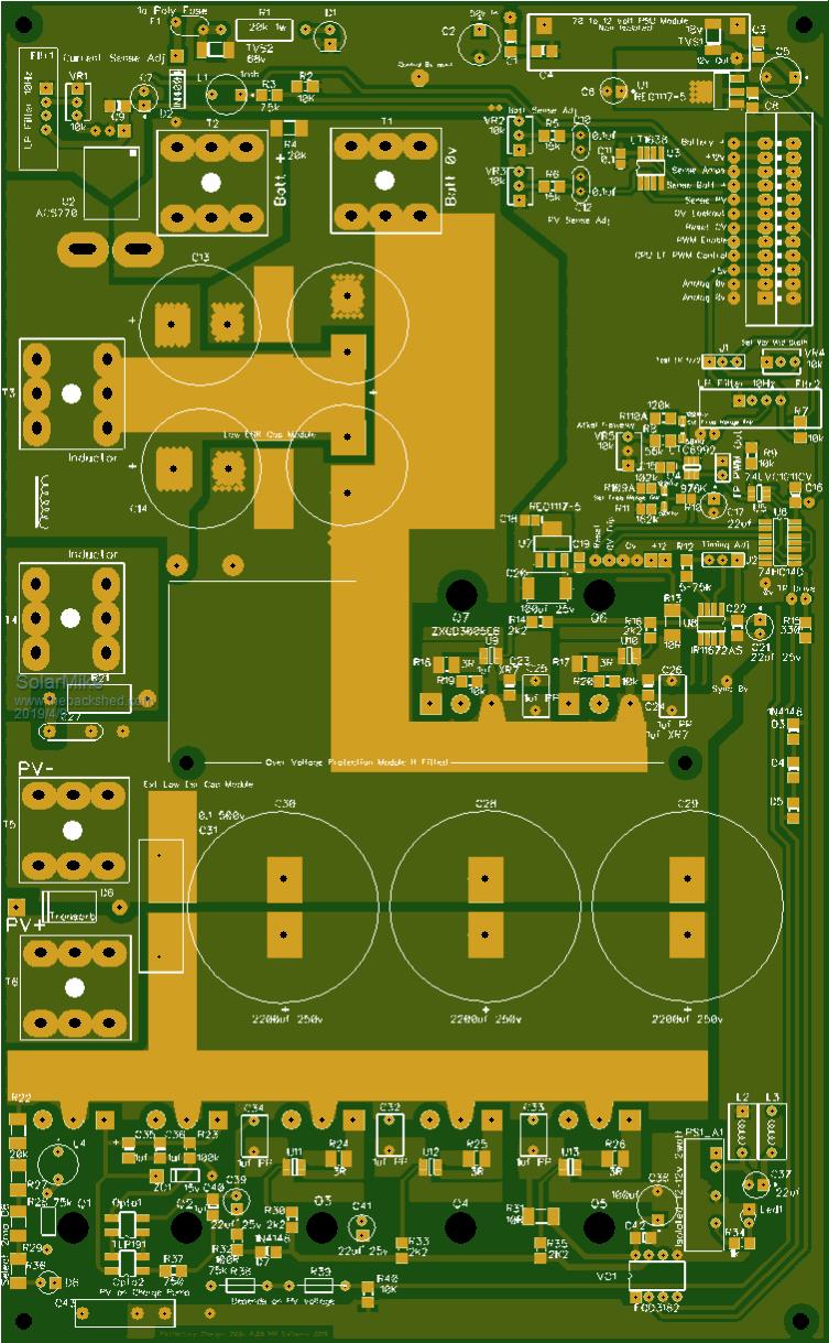 Onward, its been a bit of work to modify the main power board, have added a HF modulator and associated components to easily allow full mppt control by an add on CPU board. Ready to send off to get test boards. Final size is 243 x 150mm, have widened some of the main current tracks to allow use of 1oz copper.