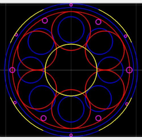Hi Oztules, I may have enough room to increase the wire size further, just kidding. here is a clearer pic of the expected layout. I had to juggle the extracting bolt position to avoid magnets and coils. The magnets are the 8 blue smaller circles. The 6 red medium circles are the coils. The yellow circles represent one rotor ring. The opposite rotor is a fullsize disk, on the other end of the can, that is the blue large dia ring.