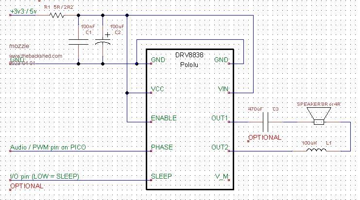 @Thwill Apologies for the cranial detonation I hope you've recovered Analog electronics takes years to learn, I'm at 40+ and still learning If it's any consolation, my programs cause regular cranial detonation For driving A small 8R speaker from a Pico: @Volhout As suggested, the DRV8838 H bridge module is now hooked up and makes an excellent PWM buffer amp. Output is almost (-200mV) rail to rail into a 8R voicecoil (8R + 37uH) and is virtually silent at no signal and equivalent to the 3W PAM at full output. Current draw is 50mA with a 100uH inductor in series with the speaker. Circuit is Module + Supply decoupling + Speaker + (optional) Inductor If designing anything with simple audio output this will be my choice. Output is better than the emitter follower design but you are reliant on the supply of the module or getting the tiny package soldered, I like discrete solutions sometimes due to an oversupply of transistors etc here Regards, Lyle. |