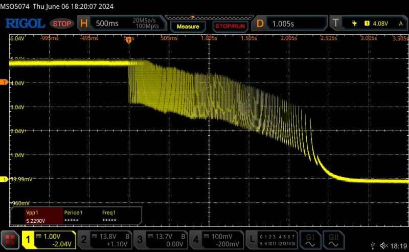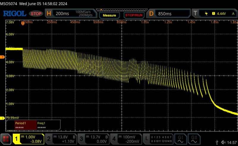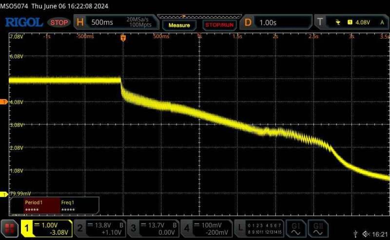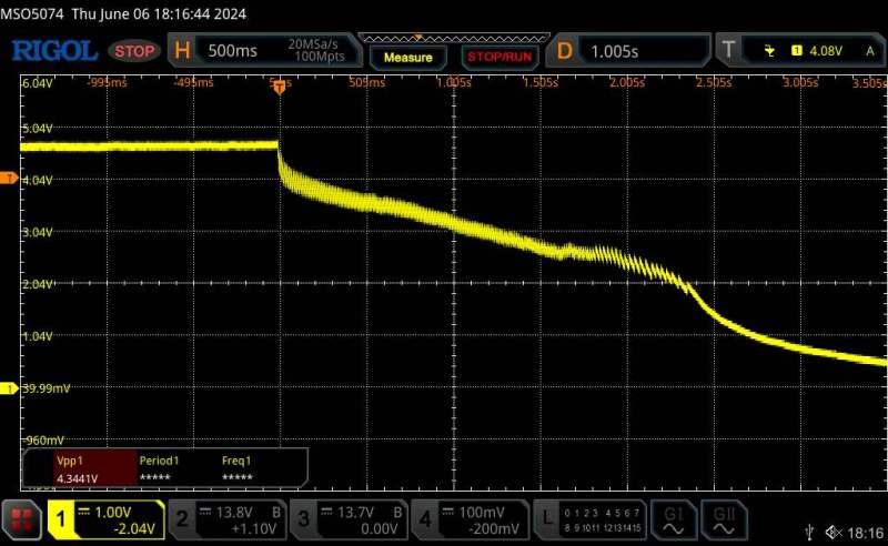 Finally, a small 6v 1000uf electrolytic across the LCD plug on the controller, a slight noise at 2.7v then a smooth slope.