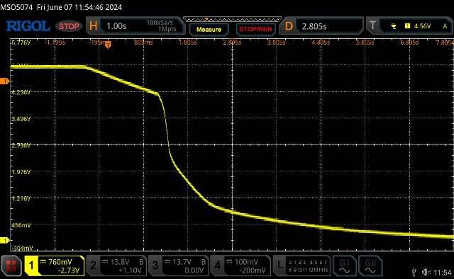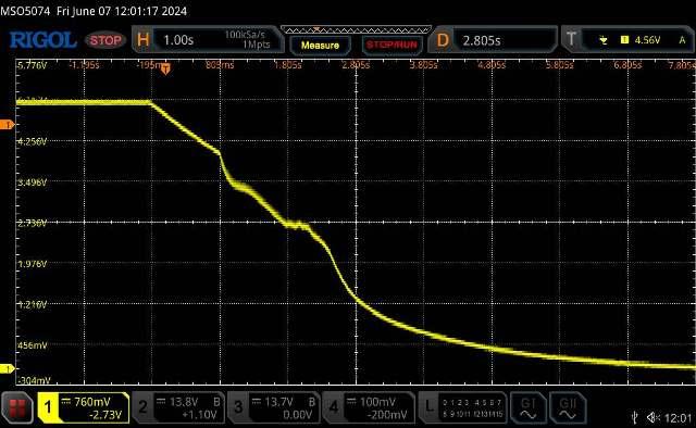 I didn't save the next capture but it shows the same bit of noise on the end of this one as it drops, it's coming back from the 5v regulator in the next pix, which has almost a 2vp-p saw-tooth around 90Hz.