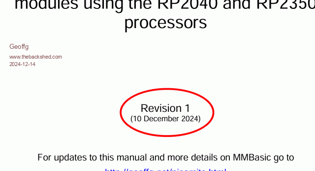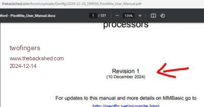 That is the Revision 0 link. This is the Revision 1 link. https://www.thebackshed.com/forum/uploads/Geoffg/2024-12-10_194930_PicoMite_User_Manual.pdf Note the date in the link. |