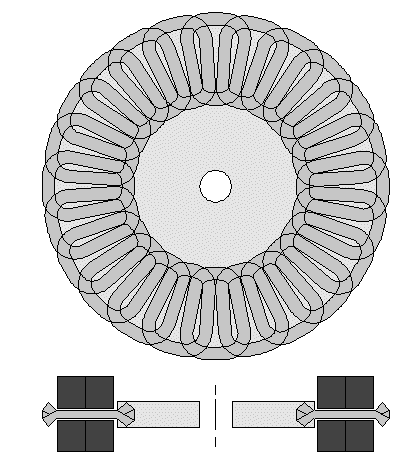 I already built one of those with 50 x 50 x 25 mm ferrites - a 12 pole 36 coil. It didn't make any more power than the flat 16/12 or 12/9 arrangement. Just because these ferrite magnets are weak doesn't mean you can't make power with them. You have to think outside the box a bit and forget all the "conventional" designs. Keeping the air gap very tight is important and it's easiest to get the air gap tight with a flat coil arrangement. Because you have to use more turns of wire with the ferrites, putting more coils in series helps get the voltage, hence the reason I used dual single phase stators stacked and skewed 90 electrical degrees to build a two-phase machine. To get the internal resistance down you have to forget using the wye configuration and use either delta or IRP, and wind with big wire. Hugh and I disagree on this, but I"m the only person who has ever built a solid 1.8 kW ferrite axial generator for a homebrew turbine. Hugh likes the wye configuration. But after I tried four different configurations of it, I arrived at the conclusion that if you're going to build a polyphase ferrite generator all contained in one stator, and get output comparable to a neo, it's going to be one bloody big and heavy unit. The output of an air gap axial is determined by only two things - rpm/volt and internal resistance. If you want more power you have to reduce one or both of those. If you put the pencil to it and do some figuring, you only got so much flux density in the air gap and adding more coils in series to build an overlapped coil stator helps get the voltage with less turns. But the extra distance in coil interconnects eats up any perceived advantage over the flat arrangement. You actually end up using more wire per phase when you go to the overlapped coil design than you do with the flat. Hugh and I had an extensive discussion over this when I did it, and Hugh had long suspected that was the case. But I proved it when I built I the thing. I also tried a 10 pole 20 coil two phase unit in one stator. I ran into an immediate problem with that configuration - I couldn't get big enough wire in it and keep the stator thickness down to 12-13 mm. In the end I ended up with the dual stator unit. It makes the target 60 amps @ 30 volts in a 78.8 lb (35.7 kg) package. To achieve that output (same internal resistance and rpm/volt) in one stator would've yielded a generator almost 3x the weight and about 2.5x the size. And once you start increasing the size, the runout tolerances on the rotors have to be increased, meaning you'll have to run a wider air gap to prevent stator/rotor contact in real world operation. You can machine rotors +/- .04mm, set a tight air gap and bench test it and it will work fine. Put it on a turbine and it'll hit the stator and damage it. BTDT. So I allow at least 2.5 mm clearance between the magnet faces and the stator on 280mm rotors to prevent contact in real world operation because things flex under tremendous loads at high output on the turbine. The bigger the rotors, the more tolerance you have to allow. The more tolerance you allow for axial runout, the more wire you have to add to compensate for reduced flux density with the ferrites. It's a vicious circle. At any rate, really good project, Glenn! I look forward to more of your testing results. -- Chris off-grid in Northern Wisconsin, USA |