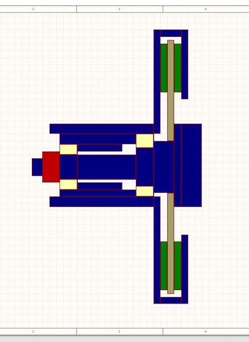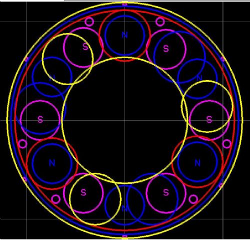 Have pretty well finalized the design for the new AxFx alternator. Here are some rough pics. This is the typical layout for magnets and coils. 3phase [red,yellow and blue] and 3coils per phase, and 12 magnets, 6 pole pairs on dual rotor disks.