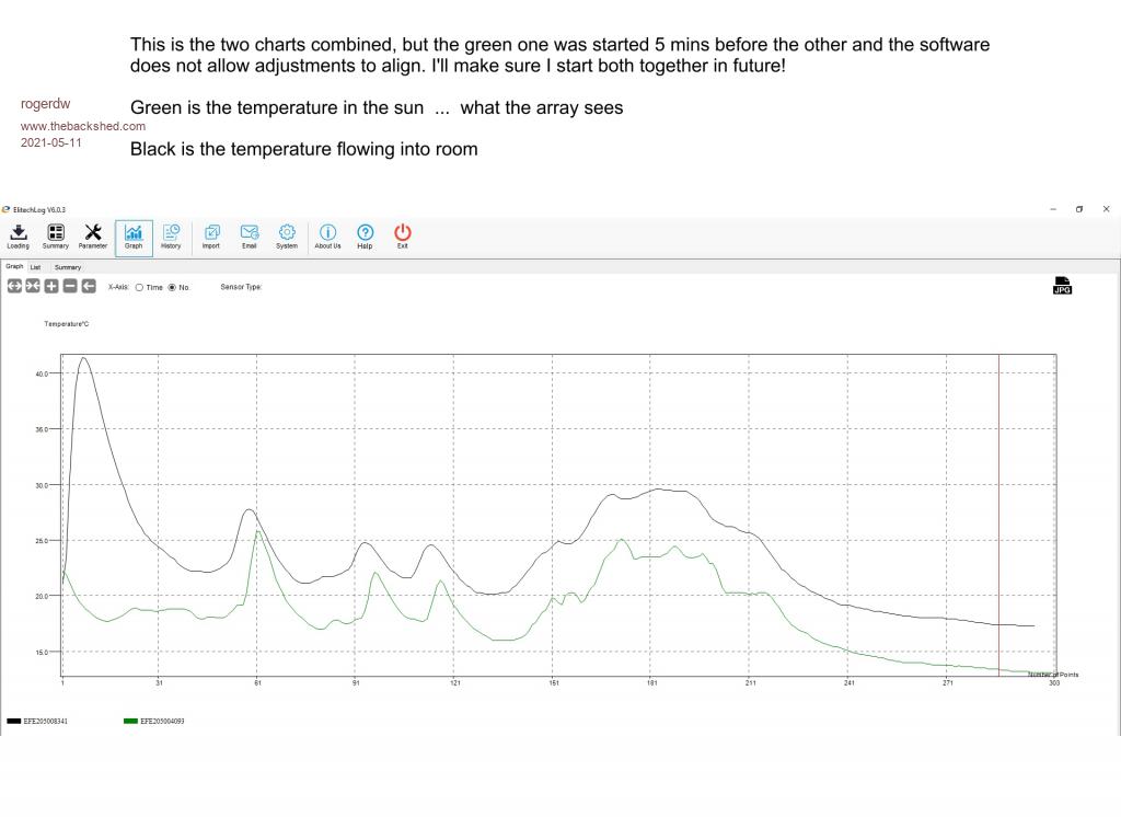 Quote  Couple of suggestions, I don't think you should have the logger in the sun and perhaps instead of inlet air, put the logger in the house and see if you can get an indication of how it's warming the place up.