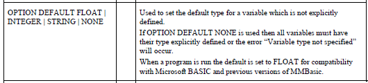 Note that with the code shown, you still haven't defined spw, spht, etc. as integers: > new > option explicit > dim spw,spht,spx,spy,sp1 integer > spw=4 > spw=spw/3 > ?spw 1.333333333 spw is a floating point variable. Please read the manual to see how to specify the type of a variable. (Many people have already shown you correct examples.) PicoMite, Armmite F4, SensorKits, MMBasic Hardware, Games, etc. on FOTS |