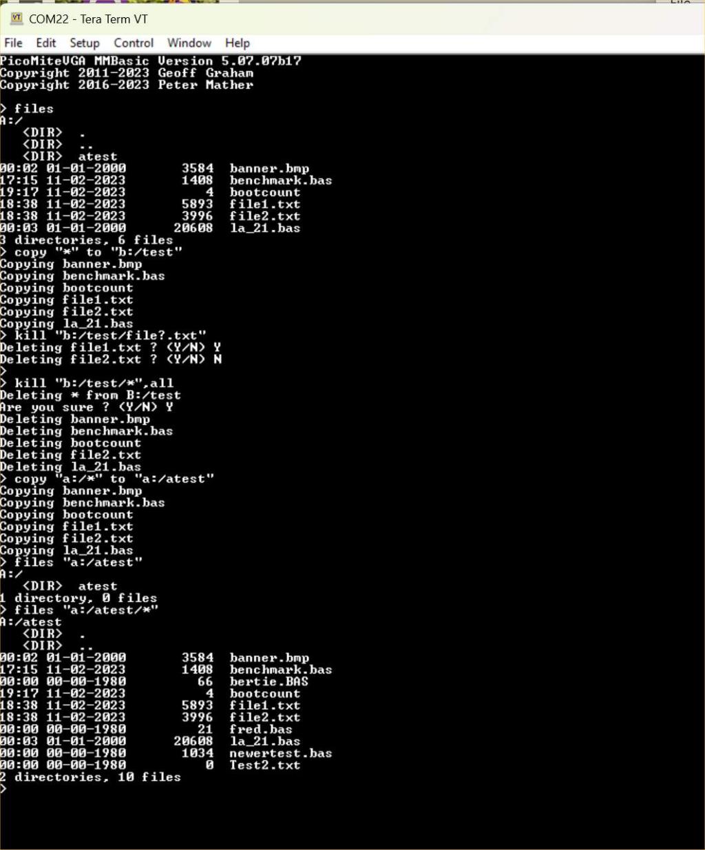 V5.07.07b17 https://geoffg.net/Downloads/picomite/PicoMite_Beta.zip Since we now have two disks available I though I'd better improve the ability to work with files in bulk Wildcards for copy and kill As in the files command * matches multiple characters and ? matches a single character. COPY fname$ to dirname$ ' the bulk copy is triggered if fname$ contains one or more '*' or a '?' characters dirname$ must be a valid directory name and should NOT end in a slash character KILL fname$ [,all] ' the bulk erase is triggered if fname$ contains one or more '*' or a '?' character If the optional 'all' parameter is used then you will be prompted for a single confirmation If 'all' is not specified you will be prompted on a file-by-file basis |