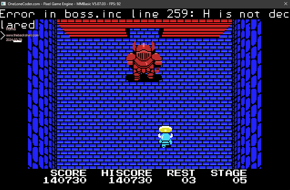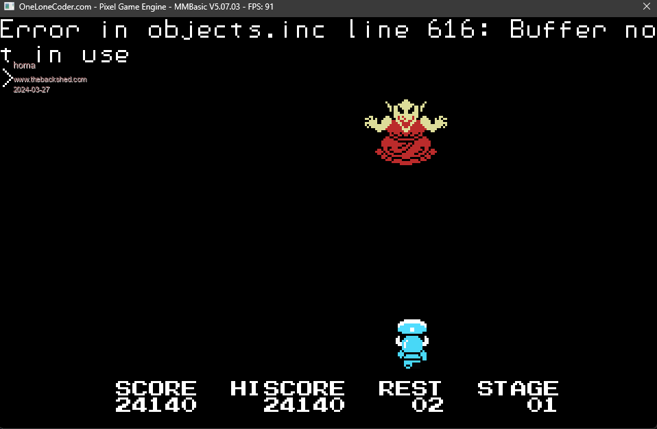 Hi Leo, I tested the current git version today with the MMBasic you specified. So far it works! Even with XBox controller and/or keyboard without any code changes. However, there is an error with the final boss in level 1 ... And I think you should update the GIT info page. https://github.com/leonicolas/knightmare-cmm2 ![]() It still refers to an old, incompatible version of MMBasic. And I can confirm Bill's problem: "It seems also that you cannot shoot while moving". Matthias |