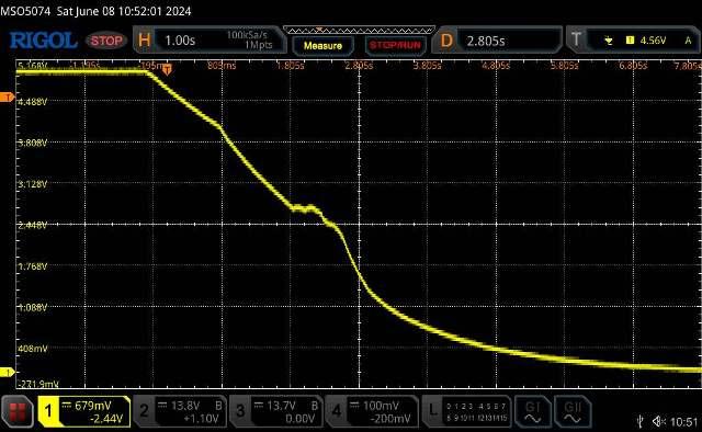 A final DSO image of the 5v rail as inverter is powering down. Test caps I had on the LCD plugs are of course removed. I removed the Controller, added a small 1000uf to the output of the 7805 linear regulator, and added a 220uf to the input (across the 12v). Both simply solder into the existing holes next to the 7805 very neat, no mods, no tracks touched. If you get a small SMPS regulator this clean then go for it, but if not, I think the simple 7805 change and the supervisor IC mod will give you all the peace of mind you are seeking. ![]() . NANO:Inverter V 8.2ks - Linux AvrDude GUI script V4.1 |