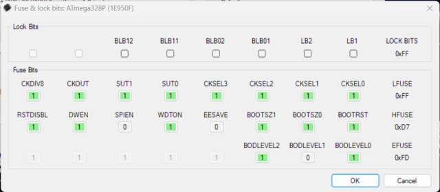 2: Setting and Reading the Nano configuration Fuses: Nano Fuses are "programmable nonvolatile registers", one is used to stop EEprom data "Inverter settings", from being overwritten, "lost" when Nano Flash is erased or when uploading New inverter HEX code to the Nano. 1: Press the lower Read button on the "Fuse & lock bits" frame. 2: Press the long "Bit selector" button. See Last post for the location: The following image is likely what you will see for a New Nano board. The two blue boxes BLB12, BLB11, are the boot loader protect bits. They stop that area of Flash memory from being overwritten when uploading standard Arduino code files via the boot loader and USB port in the Arduino IDE. Below: New Nano with boot-loader Config bits. ![]() Below is what we want the bits to look like. ![]() Now, there is something strange going on when reading and setting these Bits but doing the following works. 1: Read the Top "L" block 2: Set the Bit boxes to look like the last image above. 3: Press "OK" to close the popup window. 4: Press the Top write button. 5: Press the Lower "LB" write button. Now repeat with the lower block 1: Read the Lower "LB" block. If it EESAVE is not equal to 0, do the following: 2: Set the Bit boxes to look like the last image above. 3: Press "OK" to close the popup window. 4: Press the Lower write button. Now confirm both read the same. The Main setting we really need correct is EESAVE "it must be 0" Saving and restoring Inverter configuration and setup to follow . NANO:Inverter V 8.2ks - Linux AvrDude GUI script V4.1 |