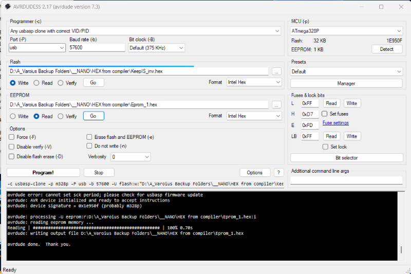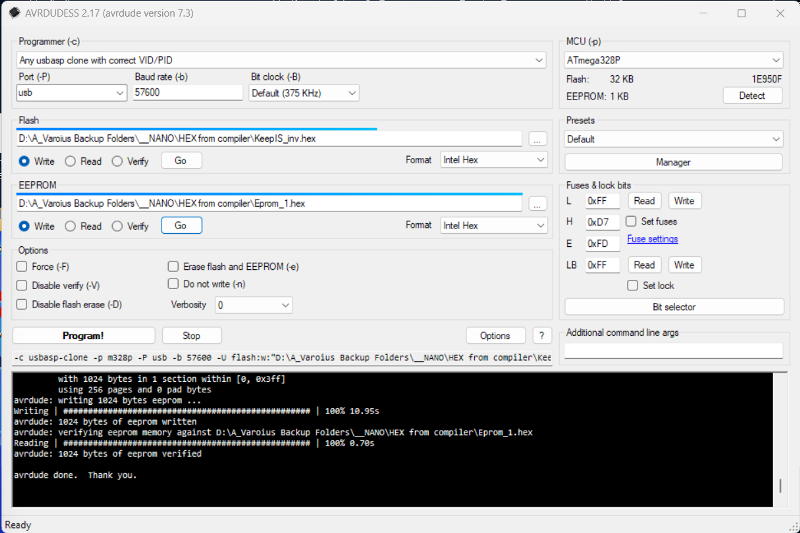 This is a Nano I've had for around a year, it's from Keyestudio, a bit expensive though. Th first one I've seen with a crystal next to a CH340 USB controller. The mod is similar to the previous posted Board 2. I posted this somewhere else but I'll repeat it here. I finally downloaded that file I was after and it only gives two BOR options, the lower voltage setting is marked as reserved. The Nanos I have checked are set to Mid setting of between 2.5 - 2.7 range. I will go through the other clones when I add the headers. The lowest setting is marked as reserved. (No 1.8v option shown) I have to say that using the small Programmer with a modified Nano is actually nice because: When writing code in the Arduino IDE and then uploading it to test, requires any other program using the Com port, like a Console Terminal program to be disconnected, after the upload has finished, it has to be reconnected again. It does not sound like much, but after a while it grinds on me. Using the Programmer with AvrDudess allows you to point this program to the compiler output directory used by the IDE. So I build-verify the code in the IDE as normal, then Press Upload in the AVR program window and it's done. Yes you can do this with the IDE, but there are options available to speed the upload up which are not available in the IDE - you can go behind the scenes and make edits, but what a PIA. The big advantage is that the USB port on the Nano is not used to program, it remains connected the the Terminal Coms program, and debug or other output streams to the Terminal program when the upload is finished. . NANO:Inverter V 8.2ks - Linux AvrDude GUI script V4.1 |
