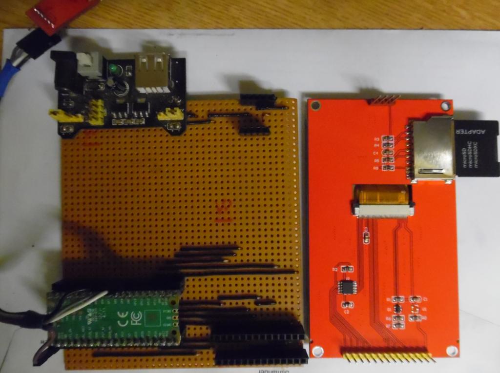 the touch and sd card work. poor photo but pixels seem brighter than old 9488. a side by side comparison maybe one day but £13 it'll be my non vga device. glad I squeezed it in to existing 9488 strip board with another header, it's about 1CM longer |
