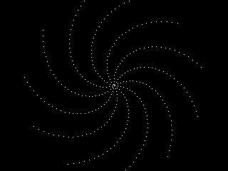 X0=MM.HRES\2: Y0=MM.VRES\2 Do Inc I,.001: If i=360 Then i=.001 C=Cos(i): S=Sin(i) X=MM.HRES/800: Y=0 CLS For R=1 To 320 Pixel X0+R*X,Y0+R*Y T=X*C-Y*S Y=X*S+Y*C X=T Next Pause 30 Loop While Inkey$="" |