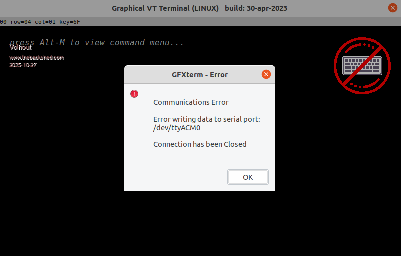 @Peter, When I connect a PS2 keyboard, I can type text, and that text is reflected on the console terminal. So it is just the console->pico channel that is blocked. The other way works. EDIT: My earlier remark was incorrect. When I type absolutely no key on the console keyboard, the terminal app closes immediate. when I type a character like <ENTER>, then it refuses to close until it times out. Volhout P.S. I am getting dinner, will be back later tonight. Edited 2025-10-27 02:22 by Volhout PicomiteVGA PETSCII ROBOTS |
