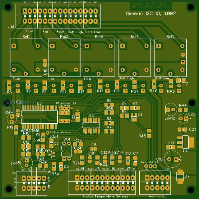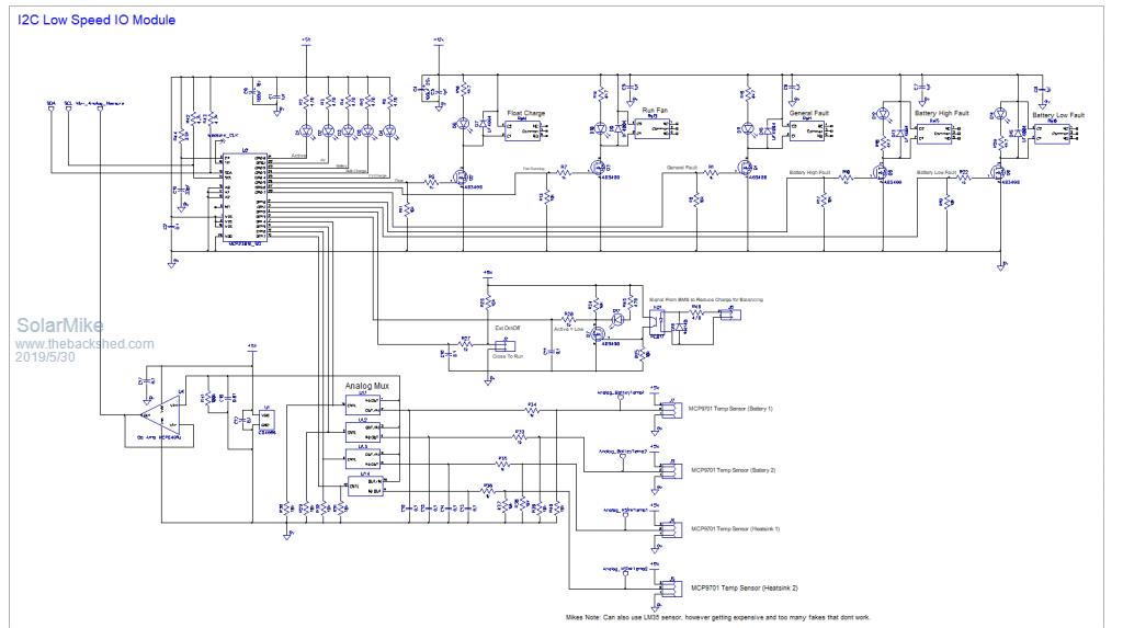 As the controller requires lots of IO's to connect to various leds, relays, temperature sensors etc and its all slow speed stuff, have decided to implement this on a separate pcb that can be mounted behind the front panel; its also pretty generic, so can be used for other projects. By using the 16bit I2C expander chip, mcp23016, this frees up CPU IO, so have more choice using a smaller device, and no haven't decided what CPU to use yet (suggestions...). The LCD display can also mount on this pcb; if I use one of those cheap 4 line 20 char ones with the I2C back pack, then it can share the same SDA\SLC bus. Noted that they all seem to use an 8bit expander chip, which means all LCD data has to be sent twice as the LCD operates in 4bit mode... really slow. As I may have multiple battery banks, require a few battery temperature sensors, its easier to multiplex them to a single analog IO, was going to use the LM35; getting really expensive now and the cheap ones on EBay etc are extremely suspect going by some comments online, so have opted for the mcp9701 linear sensor at 50c each from RS. Circuit PDF:2019-05-30_211115_I2CIO.pdf Cheers Mike |