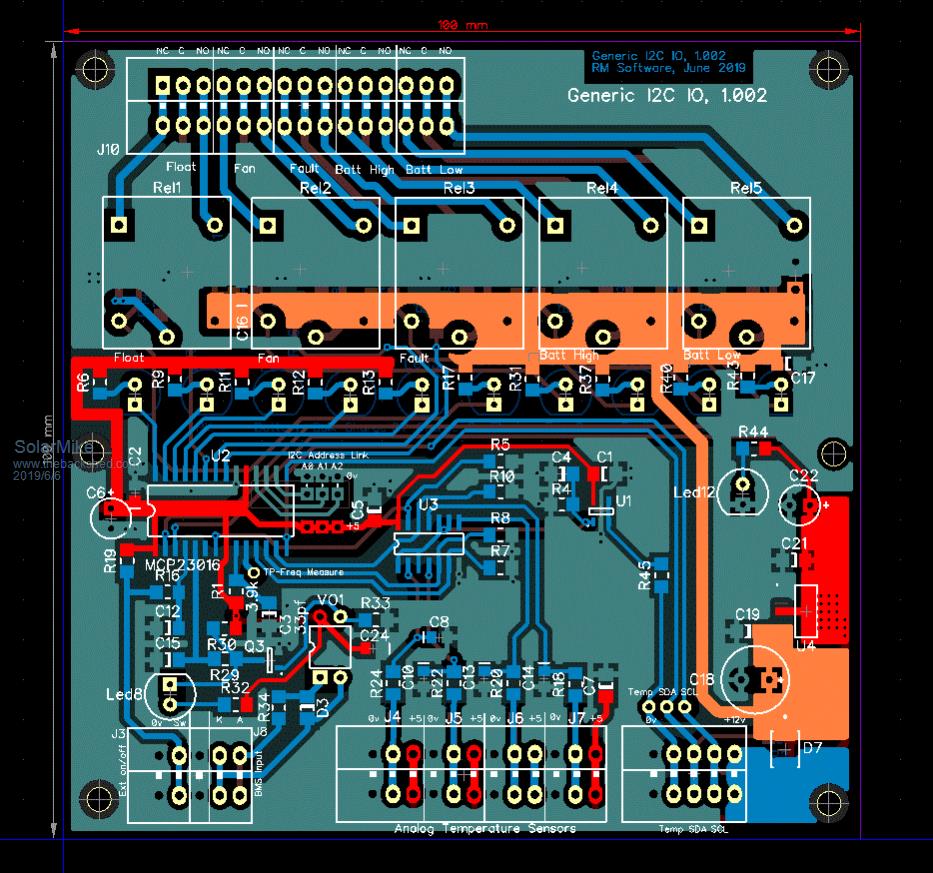 Designing a suitable cpu controller at the moment, keep running out of cpu IO pins, so have decided to use an I2C port expander chip with 16 io's MCP23016 - which I have never played with before - for connecting the slower peripherals, eg relays, leds, setting control switches. High speed cpu IO now reserved for fast analog readings, voltages and comms etc. I also want the ability for a "Master Controller" function, so when say 3 controllers are connected to a single battery bank, there will be 1 master that controls the actions of the others, otherwise they will all go to float etc at different points. The controller also has to have an input from a BMS unit that will tell the controller to reduce its charge current to a low level so balancing can be achieved for LifePo4 banks. As for testing the power board, have made few changes (Improvements) to the layout yet again and have sent gerbers away, will get pcbs back by courier end of this week, 2oz copper this time, want to try more output current... Cheers Mike |