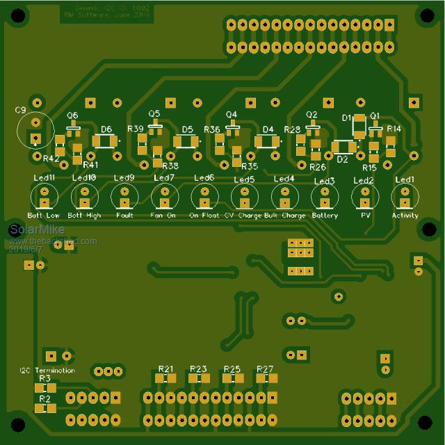 Have a PCB layout for the I2C IO board, just managed to fit on a 100x100, the rear has the Leds and opto display that pokes through the front panel. Cheers Mike |
