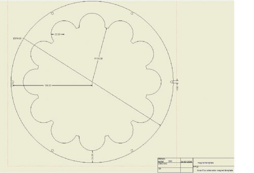 Hi vasi, the template will be used only to accurately position the magnets on both disks. The flux and some epoxy glue and maybe some carbon fibre will fix the magnets to the plates. The closed arrangement of the design will help with plate rigidity, so the magnets will stay put. I am prepared to make parts by hand where necessary, but the acccuracy of the placement determines output wave shape quality and balancing of the rotor. It would also cost more! Gordon. become more energy aware |