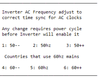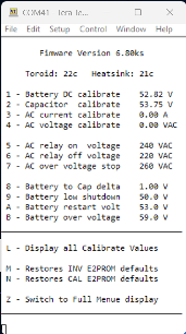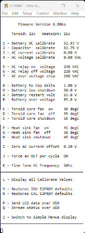 Well that was easy, simple "very slight" trim of the AC frequency for some equipment that uses AC frequency to sync a timer or clock. The first menu below is a poor, reduced in size view of the the Full menu, the setting for AC freq is item K Below that is the menu entry screen when K is selected. And finally the Compact Menu. Last item Z Switches between compact and Full each time it's selected. Full: ![]() K selection ![]() Compact Menu: ![]() ver 6.8 . Edited 2024-06-24 07:48 by KeepIS NANO:Inverter V 8.2ks - Linux AvrDude GUI script V4.1 |