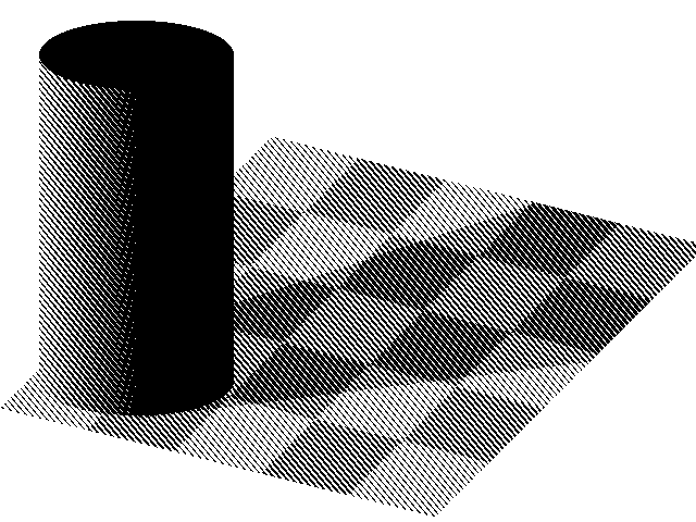 Cylinder on a plane by bazzargh 10.07.2025 # Weekend MMBasic Entertainment # Procedural graphics ![]() Q=.755/8 Z=.636363/8 C=.527225 For X=0 To 1280 Step 2 For Y=0 To 1000 Step 2 V=(X+4*Y)\500 W=(X-Y+450)\200 F=1 If (X>70 And X<430 And Y>300 And Y<900)Or((X-250)*(X-250)/8+(Y-300)*(Y-300)<4000) Then F=1-X/250:F=F*(F>0) EndIf If (X-250)*(X-250)/8+(Y-900)*(Y-900)<4000 Then F=0 If F=1 And V>1 And V<7 And W>0 And W<6 Then F=.5+.25*((W+V)Mod 2)-.25*(X>250 And X-3*Y>-900 And X-8*Y<-1600) EndIf I=Q*X+Z*Y+C I=I-Int(I) If Int(F)-(F-Int(F)>I) And 1 Then Pixel X\2,500-Y\2 Next :Next |