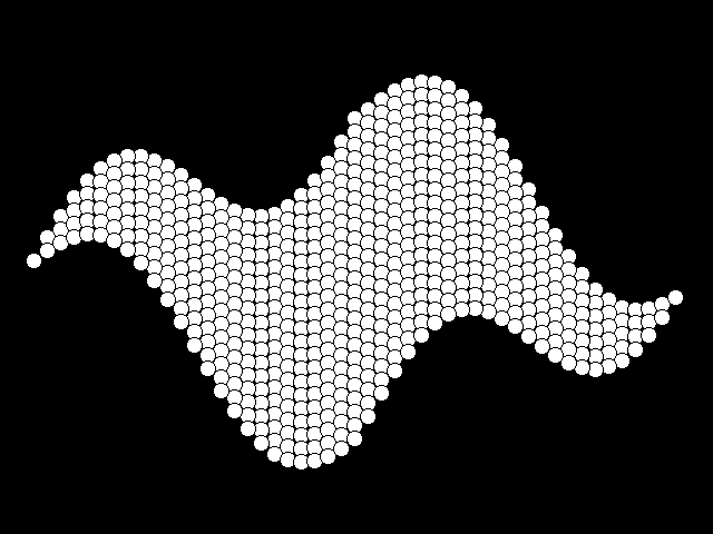 Waves 640х480 ![]() MODE 1 Dim float t,d,h Dim integer x,y,x1,y1,z FRAMEBUFFER CREATE FRAMEBUFFER WRITE F Do CLS For y1=0 To 24 For x1=0 To 24 x=12*(24-x1)+12*y1+30 y=-6*(24-x1)+6*y1+240 h=60*Sin((x1-y1)/4+t) 'h=60*Sin((x1+y1)/4+t) 'h=60*Sin(x1/2+t)+60*Cos(y1/2+t) Circle x,y-h,7,,,0,1 Next Next FRAMEBUFFER COPY F,N,B Inc t,.2 Loop |