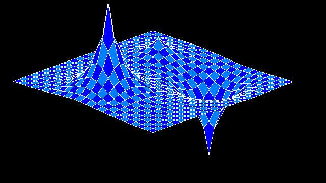 Looks even better in 1280x720 mode 3 (640x360) ![]() MODE 3 ' 640x360 Const SCREEN_HEIGHT = 360 Const Q = 3 Dim XP(Q), YP(Q), ZP(Q) As Integer Dim MX(26,26), MY(26,26) As Integer CLS ' Define charge points XP(1) = 11 : YP(1) = 6 : ZP(1) = 175 XP(2) = 17 : YP(2) = 18 : ZP(2) = -150 XP(3) = 7 : YP(3) = 19 : ZP(3) = 40 ' Projection constants Dim XS , YS As Integer XS = 25: YS = 200 ' Fill matrix with transformed coordinates For X = 0 To 25 For Y = 0 To 25 UPJE = 0 For W = 1 To Q D = Sqr((X - XP(W))^2 + (Y - YP(W))^2) Inc UPJE, ZP(W) * Exp(-D / 2) Next ' Fix grid orientation (X then Y) MX(X,Y) = XS + 11*X + 11*Y ' Flip Y-axis (to match PC-BASIC lower-left origin) MY(X,Y) = SCREEN_HEIGHT - (UPJE + YS - X*4 + Y*4) ' Optional: show control points Pixel MX(X,Y), MY(X,Y), RGB(0,255,255) Next Next ' Draw the surface E = 0 For Y = 25 To 1 Step -1 For X = 0 To 24 X1 = MX(X,Y): Y1 = MY(X,Y) X2 = MX(X+1,Y): Y2 = MY(X+1,Y) X3 = MX(X+1,Y-1): Y3 = MY(X+1,Y-1) X4 = MX(X,Y-1): Y4 = MY(X,Y-1) ' Fill with alternating pattern If (E Mod 2 = 0) Then K = RGB(0,0,255) Else K = RGB(0,128,255) EndIf Triangle X1, Y1, X2, Y2,X3, Y3 ,k,k Triangle X1, Y1, X4, Y4,X3, Y3 ,k,k XPc = (X1 + X3) YPc = (Y1 + Y3) ' Highlight border K = RGB(255,255,255) Line X1,Y1,X2,Y2,, K Line X2,Y2 ,X3,Y3,, K Line X3,Y3,X4,Y4,, K Line X4,Y4,X1,Y1,, K Inc E Next Next Save image "layer" |