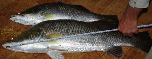 I thought you had forgotten about our barra, so above is a 76cm and 92cm "fruit of our Sea". Barra are very good eating, not the best. They have small heads, thus plenty of beautiful white flesh fillets. To catch them, pound to pound they are not the best fighter but they jump clear of the water and try to dislodge the hook by thrashing their head about whilst out of the water(often succeeding). Spectacular fighter is what they are. Yes we are extremely fortunate in OZ. I apologise to Bob for hijacking this thread a little, but you know us fishermen we are bloody braggarts. We come from the land downunder. Vic |